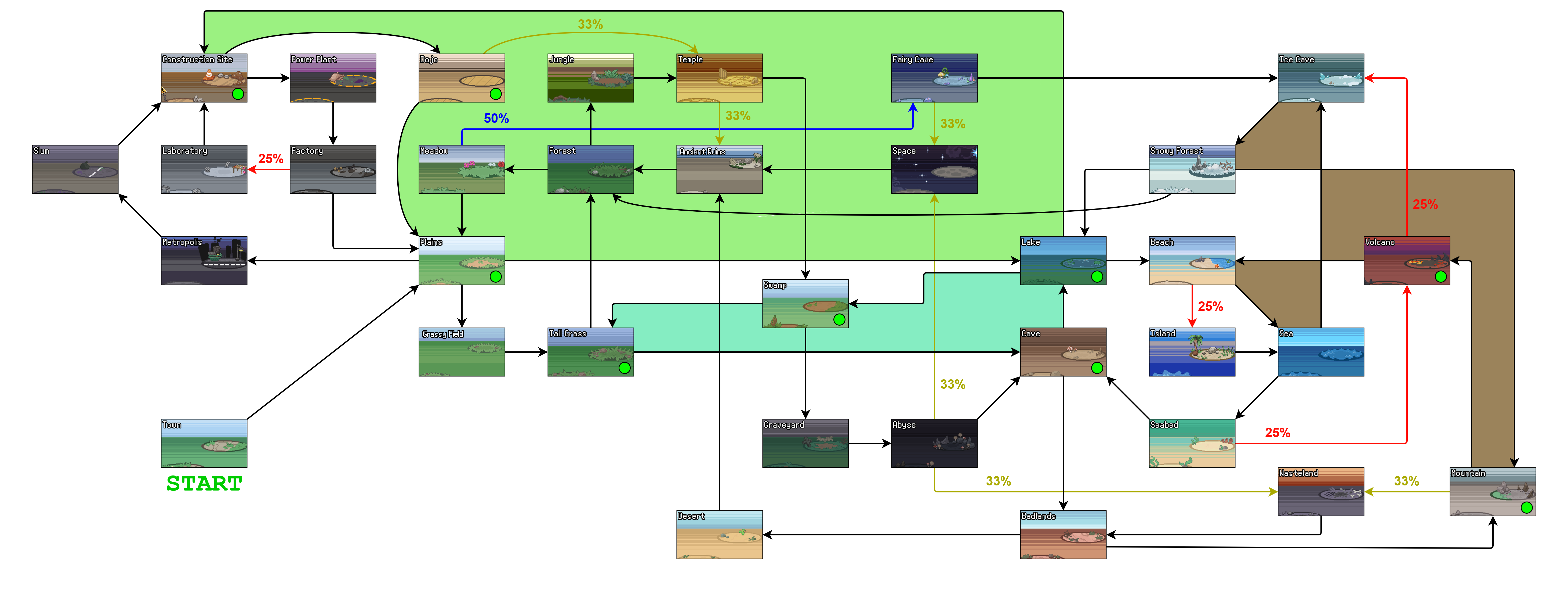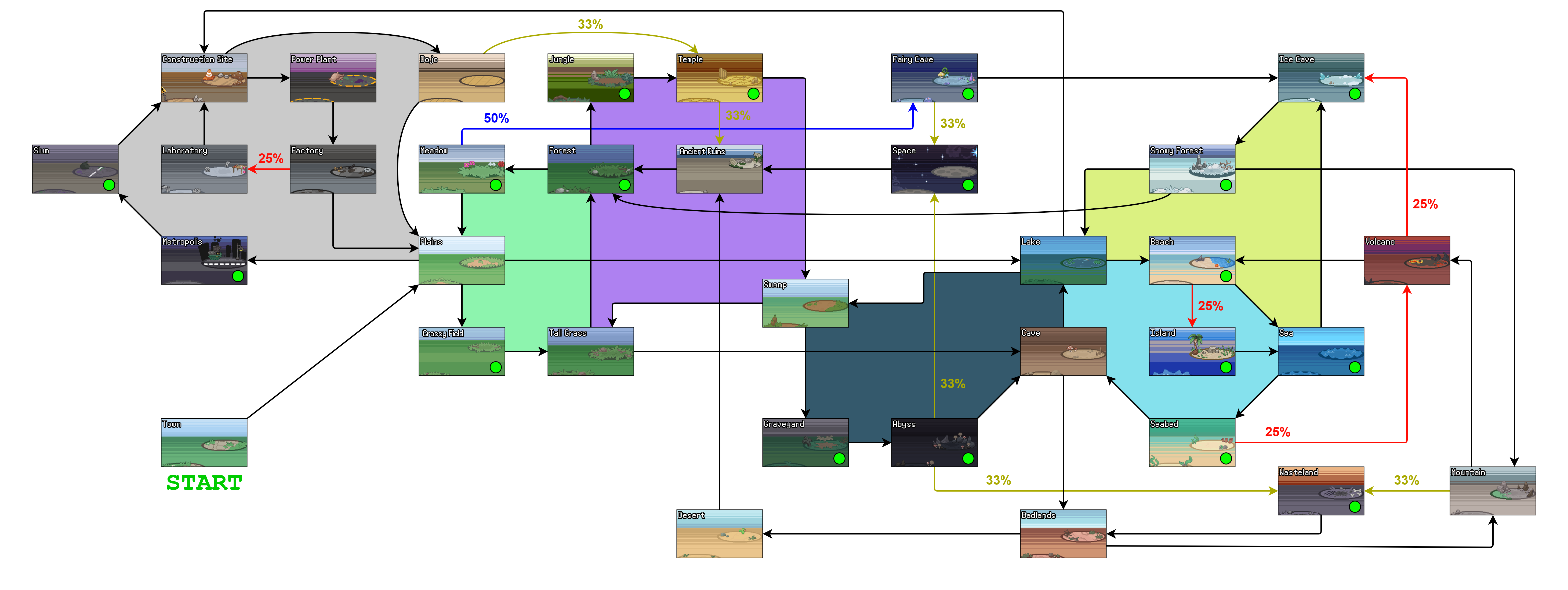 포케로그 세계는 복잡하게 연결되어 있어 한 번 지난 바이옴에도 전략적으로 빠르게 재방문할 수 있습니다. 이 페이지는 마을(한번 떠나면 돌아갈 수 없음)을 제외한 모든 바이옴의 최적 경로를 안내합니다.