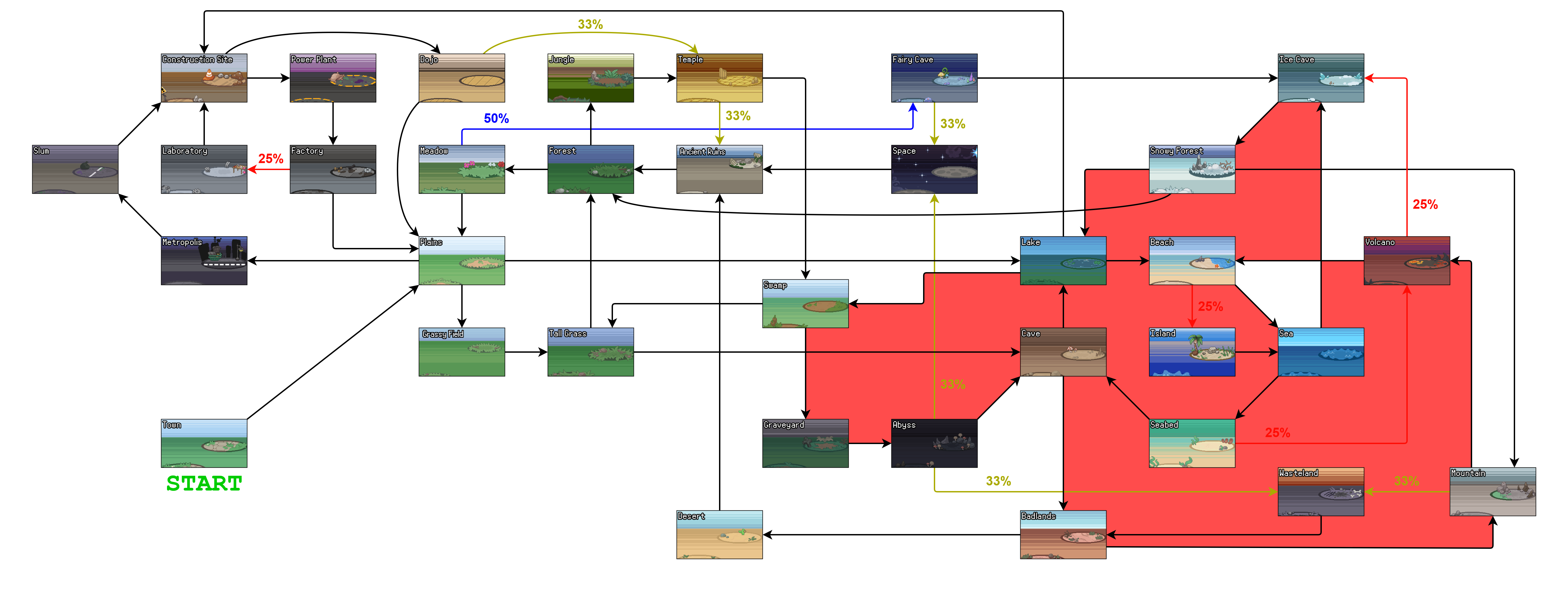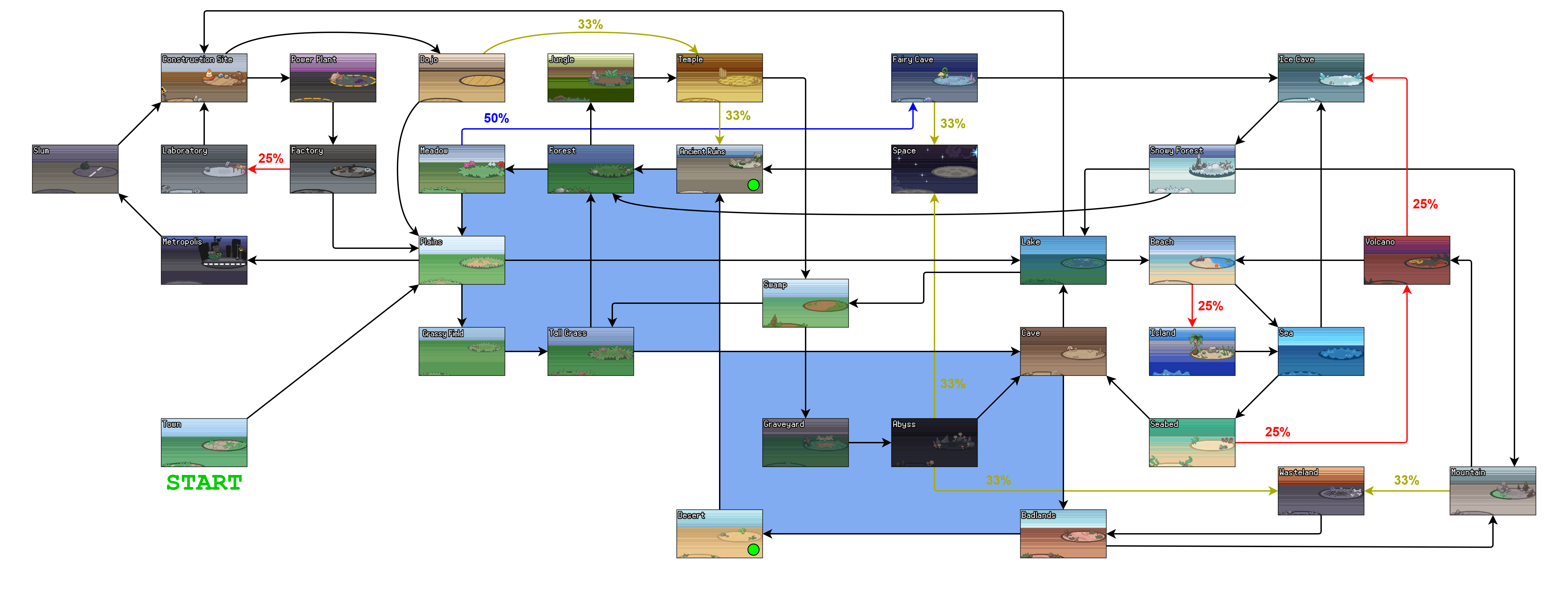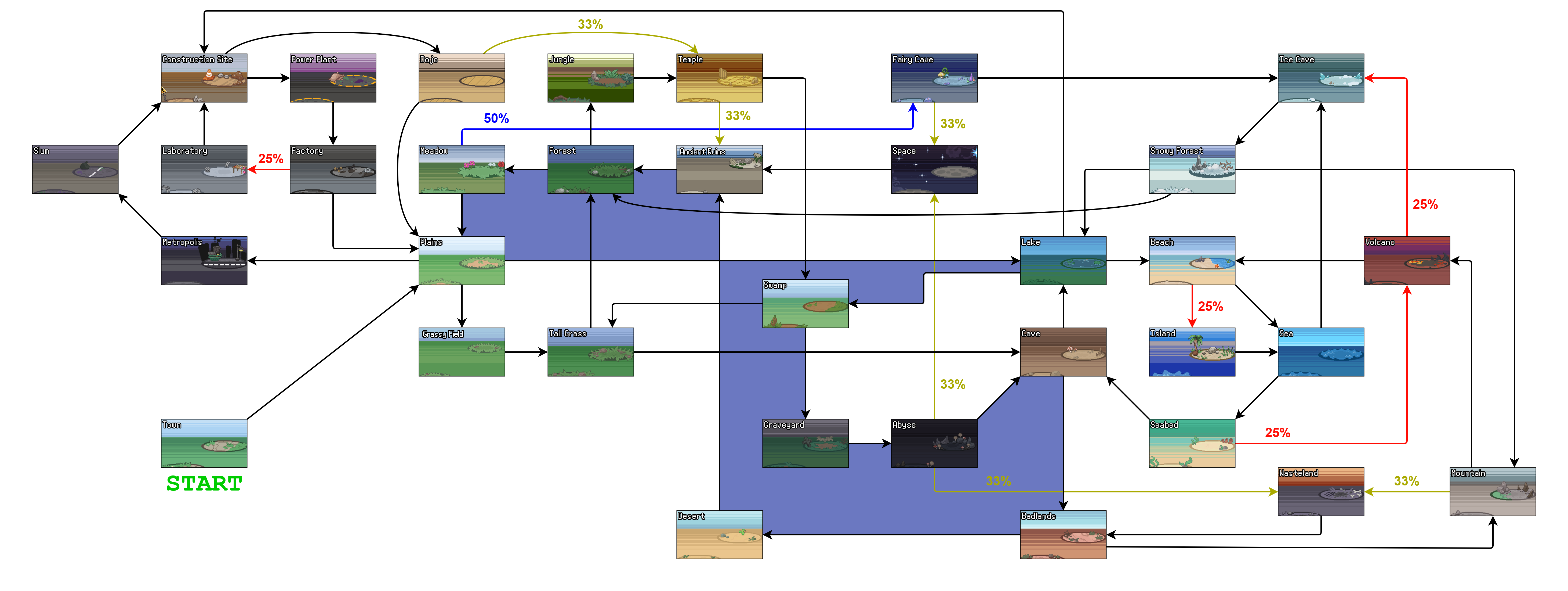 - 맵이 없으면 75% 확률로 평원, 25% 확률로 페어리 동굴로 이동.